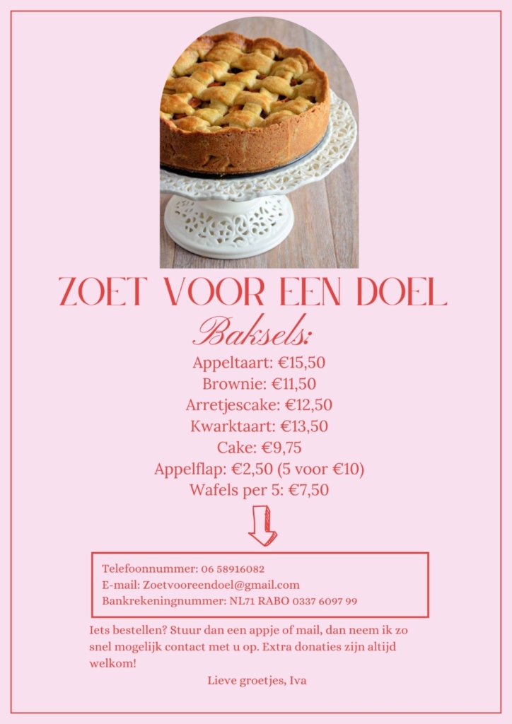 Wil je Iva steunen om haar droomreis naar Amerika waar te maken? Mail of bel Iva, om iets te bestellen uit de roze flyer Zoet voor een doel. Of scan dan de QR code, om rechtstreeks op haar GoFundMe pagina terecht te komen.